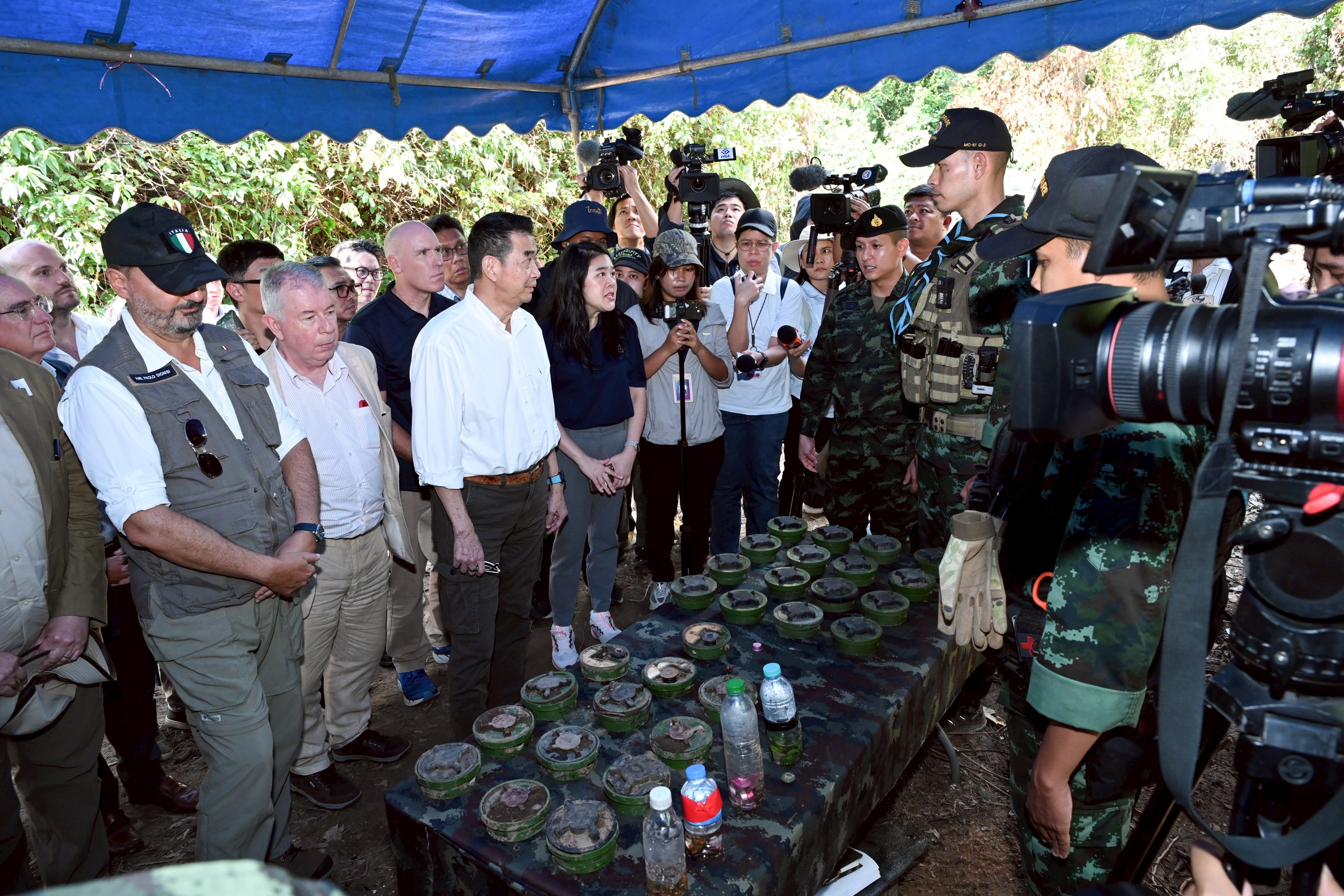 พลตรี วินธัย สุวารี โฆษกกองทัพบกกล่าวว่า ทุ่นระเบิดที่นำมาจัดแสดงให้คณะผู้แทนจากต่างประเทศได้ดู ในส่วนที่นายเฮง รัตนากล่าวว่ายังไม่ดึงสลักนิรภัยออกนั้น ถูกตรวจพบจากการเข้าตรวจค้นและทำพื้นที่ให้ปลอดภัยโดยหน่วยทหารช่าง เมื่อวันที่ 4 ส.ค. 68 บริเวณพื้นที่ภูมะเขือ ในจุดที่ทหารกัมพูชาเคยวางกำลังอยู่ บริเวณดังกล่าวฝ่ายไทยได้ตรวจพบทุ่นระเบิดเป็นจำนวนมาก ส่วนใหญ่เป็นทุ่นระเบิดแบบ PMN-2 ซึ่งที่พบมีทั้ง 2 ลักษณะ คือ ทุ่นระเบิดที่เก็บไว้ยังไม่ได้นำไปติดตั้ง จึงเห็นในภาพว่ายังมีสลักนิรภัยติดอยู่ และ ทุ่นระเบิดที่ติดตั้งแล้ว ซึ่งในกรณีนี้จะไม่มีสลักนิรภัย โดยทั้งสองลักษณะได้ถูกนำมาแสดงให้คณะผู้แทนจากต่างประเทศได้ดูเมื่อวานนี้(16 ส.ค.68)