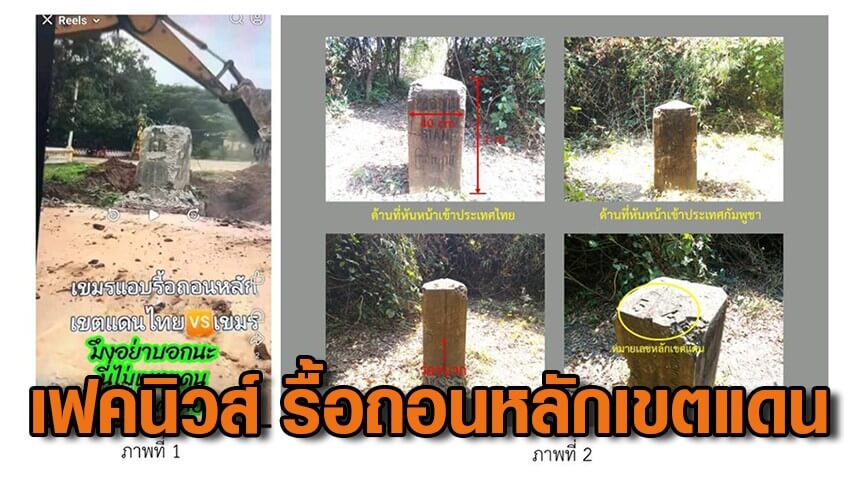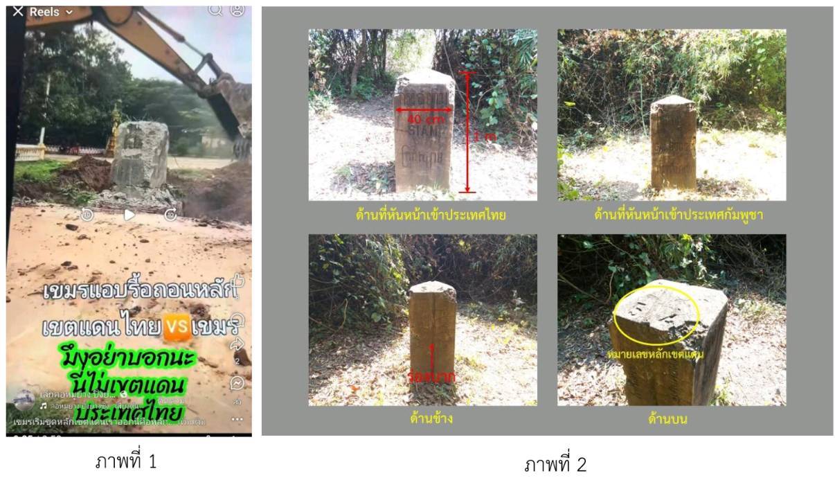 กองทัพบก ยืนยัน คลิปวิดีโอการรื้อถอนหลักเขตแดนบริเวณพื้นที่ไทย-กัมพูชา เป็นข่าวบิดเบือน อยู่ในลักษณะการใช้รถตักดินทำการรื้อถอนหลักคอนกรีต หวังสร้างความเข้าใจผิดต่อสังคม ยันของจริงสลักข้อความ 3 ภาษา ด้านที่หันเข้าหาฝั่งไทย เขียน ว่า “กรุงสยาม”