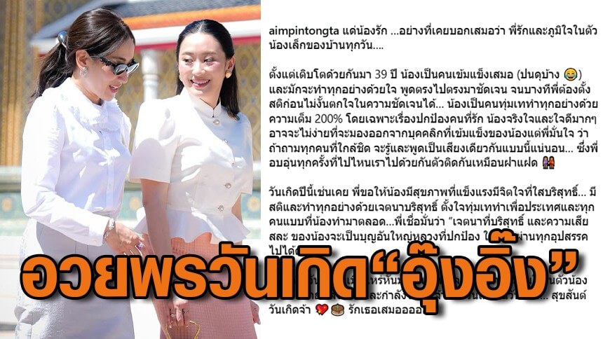 วันเกิดปีนี้เช่นเคย พี่ขอให้น้องมีสุขภาพที่แข็งแรงมีจิตใจที่ใสบริสุทธิ์ มีสติและทำทุกอย่างด้วยเจตนาบริสุทธิ์ ตั้งใจทุ่มเททำเพื่อประเทศและทุกคนแบบที่น้องทำมาตลอด พี่เชื่อมั่นว่า “เจตนาที่บริสุทธิ์ และความเสียสละ ของน้องจะเป็นบุญอันใหญ่หลวงที่ปกป้อง ให้น้องผ่านทุกอุปสรรคไปได้ด้วยดี”
