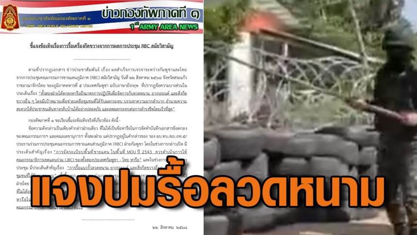 กองทัพภาคที่ 1 ชี้แจงข้อเท็จจริงกรณีการรื้อเครื่องกีดขวางจากการผลการประชุม RBC สมัยวิสามัญ โดยระบุว่า ตามที่ปรากฏเอกสาร ข่าวประชาสัมพันธ์ เรื่อง ผลสำเร็จการเจรจาระหว่างกัมพูชาและไทย จากการประชุมคณะกรรมการชายแดนภูมิภาค (RBC) สมัยวิสามัญ วันที่ 22 สิงหาคม 2568 ของภูมิภาคทหารที่ 5 ประเทศกัมพูชา ฉบับภาษาอังกฤษ ที่ปรากฏข้อความบางส่วนในประเด็นเรื่อง “ทั้งสองฝ่ายได้ตกลงหารือถึงมาตรการปฏิบัติเพื่อจัดการกับลวดหนาม ยางรถยนต์ และสิ่งกีดขวางอื่น ๆ โดยมีเป้าหมายเพื่อช่วยเหลือชุมชนที่ได้รับผลกระทบ บรรเทาความยากลำบาก อำนวยความสะดวกให้ประชาชนเดินทางกลับบ้านได้อย่างปลอดภัย และลดผลกระทบต่อการดำรงชีพโดยเร็วที่สุด”