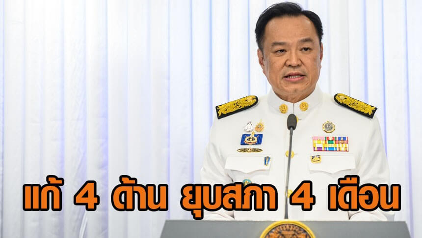 โปรดเกล้าฯ แต่งตั้ง อนุทิน ชาญวีรกูล เป็นนายกรัฐมนตรี คนที่ 32 แถลงครั้งแรก ตั้งเป้าแก้ปัญหาวิกฤต 4 ด้าน ลั่นเป็นนายกฯครั้งนี้ ไม่ได้มาด้วยบุญคุณของใคร ยกเว้นประชาชน ขอบคุณเสียงพรรคประชาชน ประกาศยุบสภาแน่ภายใน 4 เดือน ชี้เวลาจากนี้ ไม่มีวันหยุด-พักร้อน-เจ็บป่วย เชื่อสามารถมีสุขภาพดียืนหยัดทำงานได้