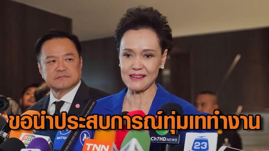 “ดิฉันในฐานะที่มีโอกาสได้ทำงานมาหลากหลาย รวมถึงงานระหว่างประเทศด้วย ตั้งใจจะนำเอาประสบการณ์ ความสามารถที่มีอยู่ทั้งหมด มาทุ่มเทให้ในระยะเวลาสั้นๆนี้ ให้เกิดประโยชน์สูงสุด ซึ่งมีธงเดียวกับนายกฯ คือทำประโยชน์สูงสุดให้กับประเทศชาติ และพี่น้องประชาชนให้ได้อย่างเต็มที่ เต็มความสามารถ”