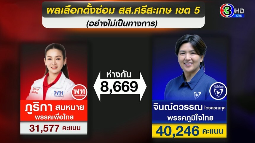 ผลเลือกตั้งซ่อม สส.เขต 5 ศรีสะเกษ จินต์วรรณ พรรคภูมิใจไทย แย่งที่นั่งของพรรคเพื่อไทยมาได้สำเร็จ ด้านเพื่อไทยแถลงรับความพ่ายแพ้ แต่ไม่หวั่นไหว ยังพอใจกับคะแนนที่ได้ ถือว่าฐานคะแนนยังเหนียวแน่น ขณะที่หลายฝ่ายมองคะแนนจากพรรคส้มที่ครั้งนี้ไม่ได้ลง อาจไหลไปที่น้ำเงิน