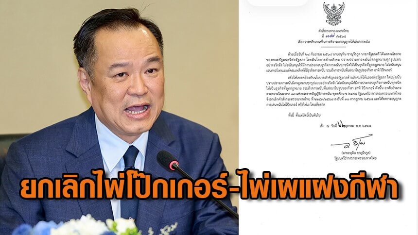 “อนุทิน” นายกรัฐมนตรี เซ็นคำสั่ง “มหาดไทย” ยกเลิกการอนุญาตการเล่นพนันไพ่โป๊กเกอร์-ไพ่เผแฝงกีฬา โดยเด็ดขาดสอดนโยบายรัฐบาลไม่ส่งเสริมการพนัน