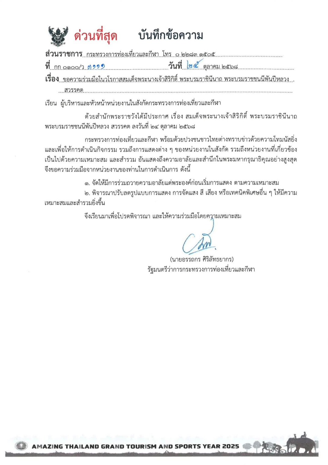 วันที่ 25 ต.ค.2568 นายอรรถกร ศิริลัทธยากร รัฐมนตรีว่าการกระทรวงการท่องเที่ยวและกีฬา เปิดเผยภายหลังสำนักพระราชวังมีประกาศเรื่อง สมเด็จพระนางเจ้าสิริกิติ์ พระบรมราชินีนาถ พระบรมราชชนนีพันปีหลวง เสด็จสวรรคต ว่ เหตุการณ์ครั้งนี้นับเป็นความสูญเสียครั้งใหญ่ของปวงชนชาวไทย และย่อมส่งผลกระทบต่อจิตใจของประชาชน รวมทั้งนักกีฬาไทยเป็นอย่างมาก