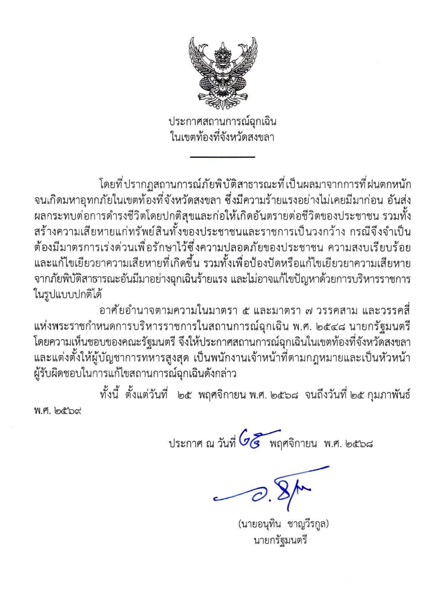 วันที่ 25 พ.ย. 2568 ทำเนียบรัฐบาล ผู้สื่อข่าวรายงานว่า คณะรัฐมนตรีมีมติให้ประกาศสถานการณ์ฉุกเฉินในเขตท้องที่จังหวัดสงขลา ตามหนังสือประกาศฯ โดยระบุว่า