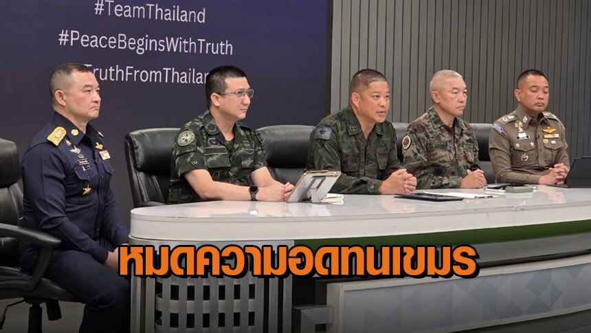 เหล่าทัพ ย้ำไทยหมดความอดทนกับกัมพูชา พร้อมรบเต็มที่ ยืนยันหากพบกัมพูชาใช้อาวุธหนักไทยพร้อมชิงโจมตีก่อน ขอประชาชนเชื่อมั่นจะดำเนินการเต็มที่ เพื่อปกป้องอธิปไตย และคุ้มครองชีวิตประชาชน