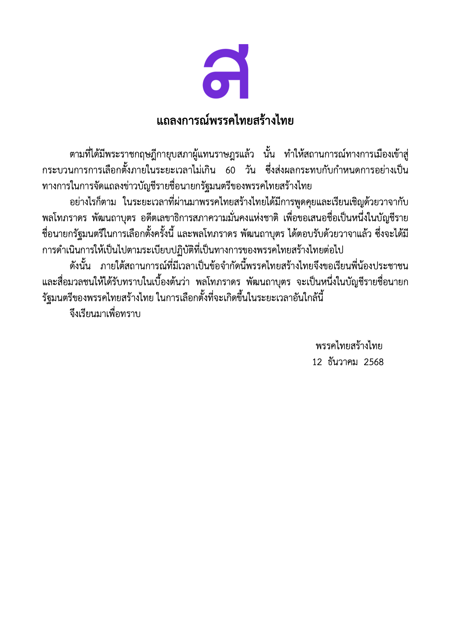 ดังนั้น ภายใต้สถานการณ์ที่มีเวลาเป็นข้อจำกัดนี้ พรรคไทยสร้างไทย จึงขอเรียนพี่น้องประชาชน และสื่อมวลชนให้ได้รับทราบในเบื้องต้นว่า พล.ท.ภราดร พัฒนถาบุตร จะเป็นหนึ่งในบัญชีรายชื่อนายกรัฐมนตรีของพรรคไทยสร้างไทย ในการเลือกตั้งที่จะเกิดขึ้นในระยะเวลาอันใกล้นี้