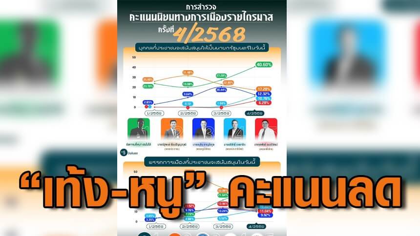 นิด้าโพล เผยความนิยมไตรมาสสุดท้ายของปี "เท้ง-หนู" กอดคอกันคะแนนลด ขณะ "อภิสิทธิ์" ความนิยมพุ่งขึ้น