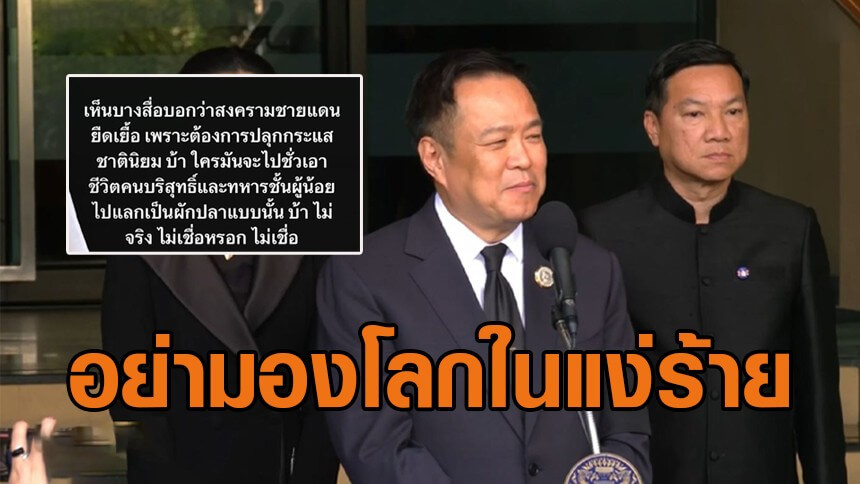 อนุทิน บอกใจไม่ถึงพอ ชิงจังหวะสงคราม เอาอธิปไตย-ชีวิตทหาร แลกคะแนนเสียงให้ตัวเอง ไล่ไปอ่านคอมเมนต์ ธนาธร โวหาก พิธา ได้เป็นนายกฯ ไทย-เขมร ไม่มาถึงจุดนี้ บอกกลัวแคนดิเดตทุกพรรค ส่วนภูมิใจไทยยึดสำนวนช้า ๆ ได้พร้าเล่มงาม ตอนนี้ตอบรับแค่คนเดียว