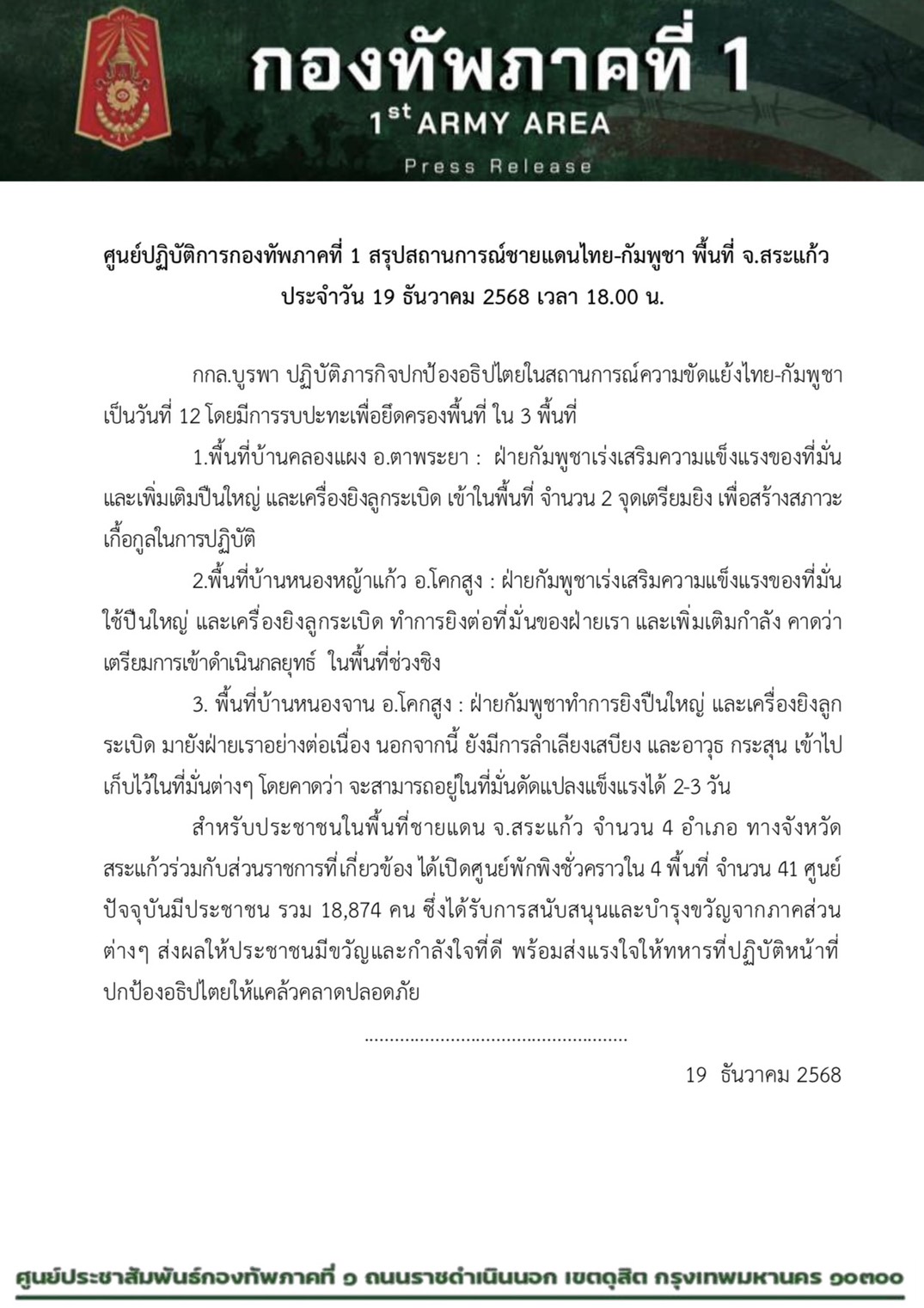 วันที่ 19 ธันวาคม 2568 เวลา 18.00 น. ศูนย์ปฏิบัติการกองทัพภาคที่ 1 สรุปสถานการณ์ชายแดนไทย-กัมพูชา พื้นที่ จ.สระแก้ว กกล.บูรพา ปฏิบัติภารกิจปกป้องอธิปไตยในสถานการณ์ความขัดแย้งไทย-กัมพูชา เป็นวันที่ 12 โดยมีการรบปะทะเพื่อยึดครองพื้นที่ ใน 3 พื้นที่