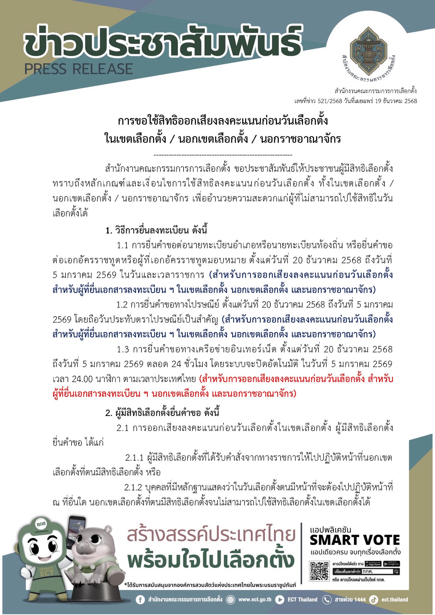 กกต.เปิดให้ลงทะเบียน “เลือกตั้งล่วงหน้า 2569” ทั้งในเขต นอกเขต นอกราชอาณาจักร เริ่มพรุ่งนี้ 20 ธ.ค.68 - 5 ม.ค.69 โดยเปิด 3 ช่องทางการลงทะเบียน