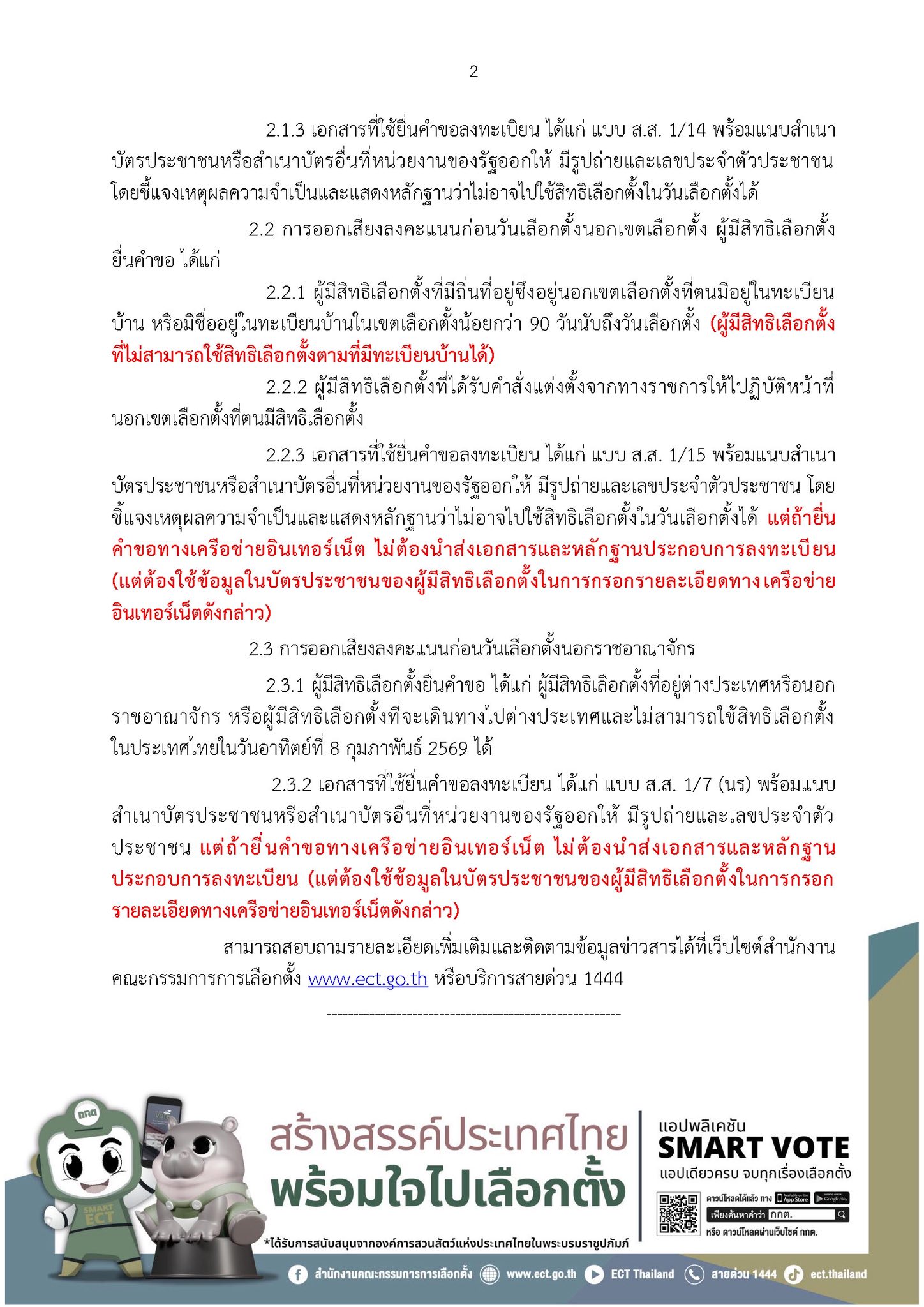 1.2 การยื่นคำขอทางไปรษณีย์ ตั้งแต่วันที่ 20 ธันวาคม 2568 ถึงวันที่ 5 มกราคม 2569 โดยถือวันประทับตราไปรษณีย์เป็นสำคัญ (สำหรับการออกเสียงลงคะแนนก่อนวันเลือกตั้ง สำหรับผู้ที่ยื่นเอกสารลงทะเบียน ฯ ในเขตเลือกตั้ง นอกเขตเลือกตั้ง และนอกราชอาณาจักร)