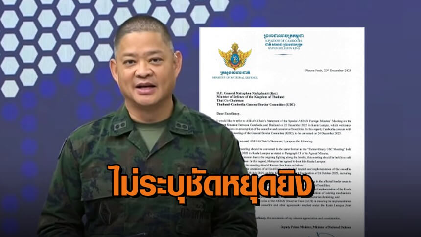 โฆษกกลาโหม ชี้หนังสือ “เตีย เซรยฮา” ส่งถึงกลาโหมไทย ไม่ระบุชัดหยุดยิง แต่มีนัยรายละเอียดกัมพูชาแสดงเจตจำนงค์ 22 ธ.ค. แต่ต้องไปถกเวทีจีบีซี