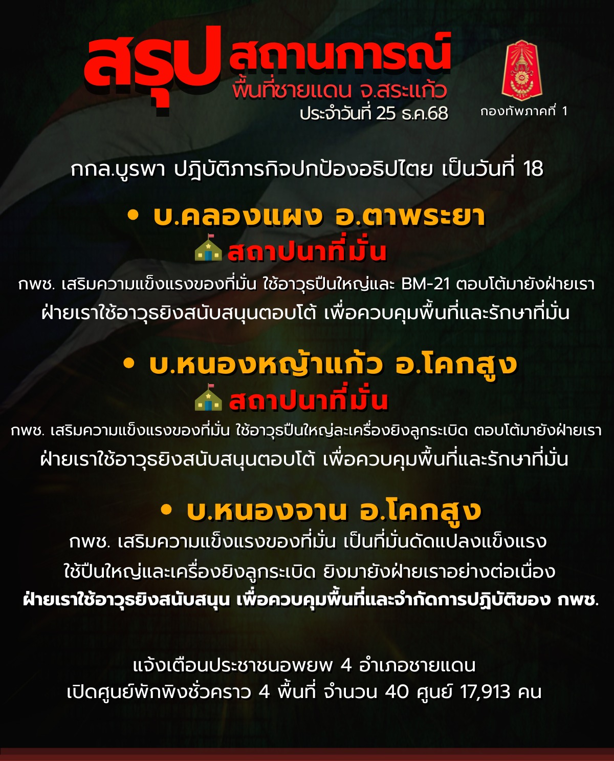 ศูนย์ปฏิบัติการกองทัพภาคที่ 1 สรุปสถานการณ์ชายแดนไทย-กัมพูชา พื้นที่ จ.สระแก้ว ประจำวัน 25 ธันวาคม 2568 เวลา 18.00 น.