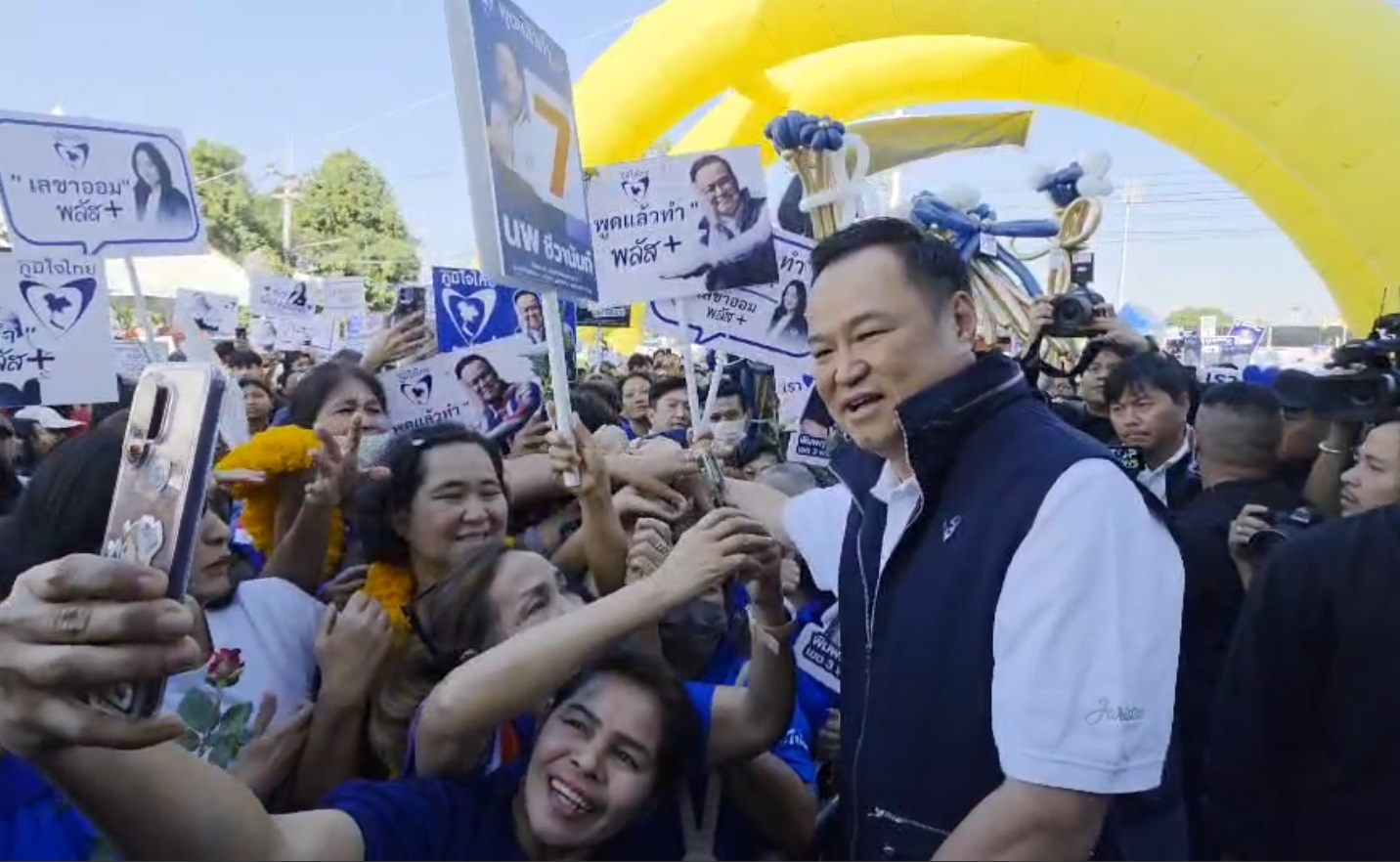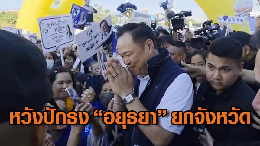 “อนุทิน” ห้อยเหรียญพระนเรศวร บุกกรุงเก่าขึ้นสแตนด์เชียร์จับเบอร์ผู้สมัคร สส.อยุธยา ภูมิใจไทย ทั้ง 5 เขต หวังปักธงยกจังหวัด ก่อนเดินทักทายกองเชียร์ ฮอตหนักแฟนคลับรุมดึงจนเซ ไหว้ศาลหลักเมืองขอประเทศไทยมีแต่ชัยชนะ ส่วนเลือกตั้งต้องใช้นโยบาย พึ่งเทวดาไม่ได้