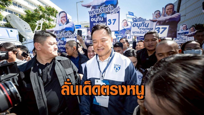 “อนุทิน” บอกได้ 37 เด็ดตรงหนูู ไม่มีปัญหา เน้นขายนโยบาย-ผลงาน เจอขวดน้ำปริศนาปลิวข้ามหัว ถูกเอฟซีพรรคอื่นโห่ไล่ ก่อนกลับ