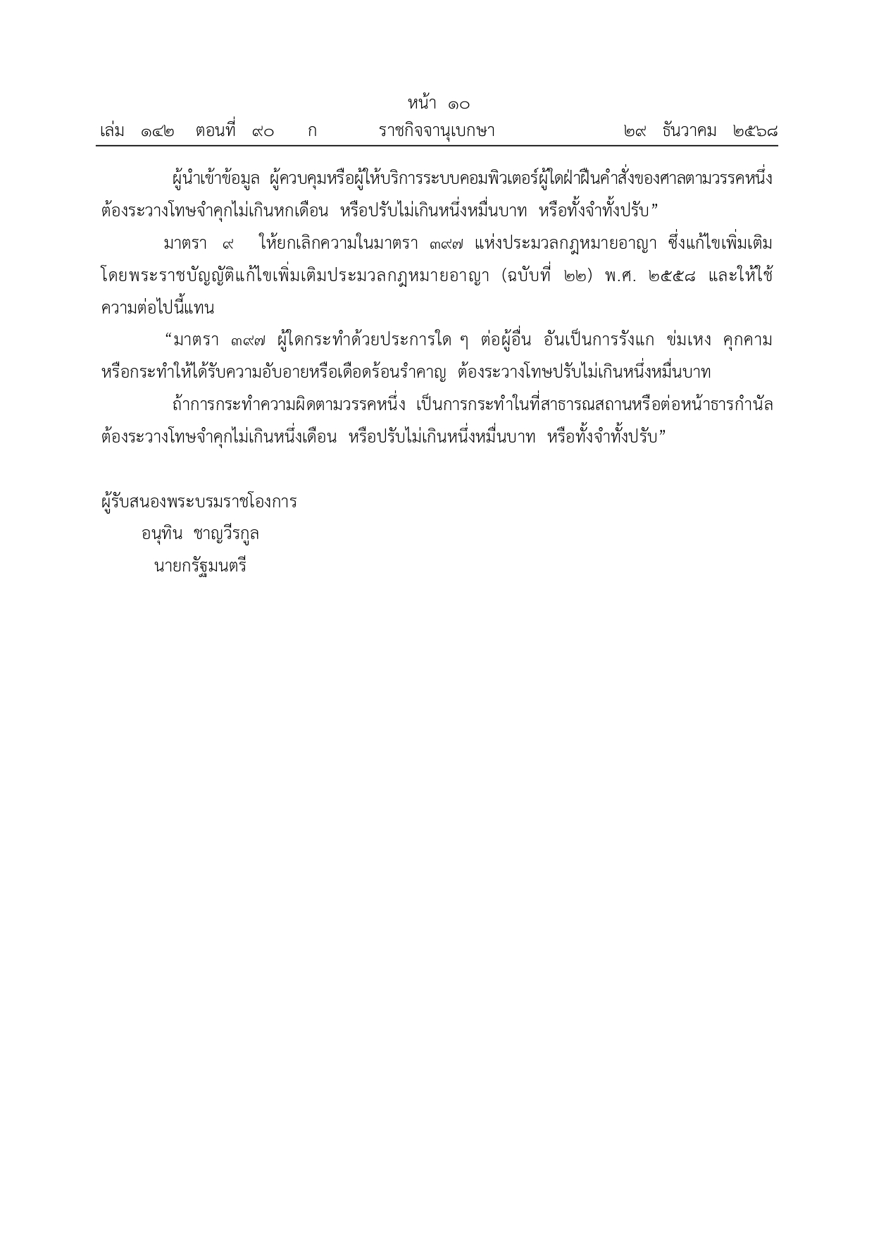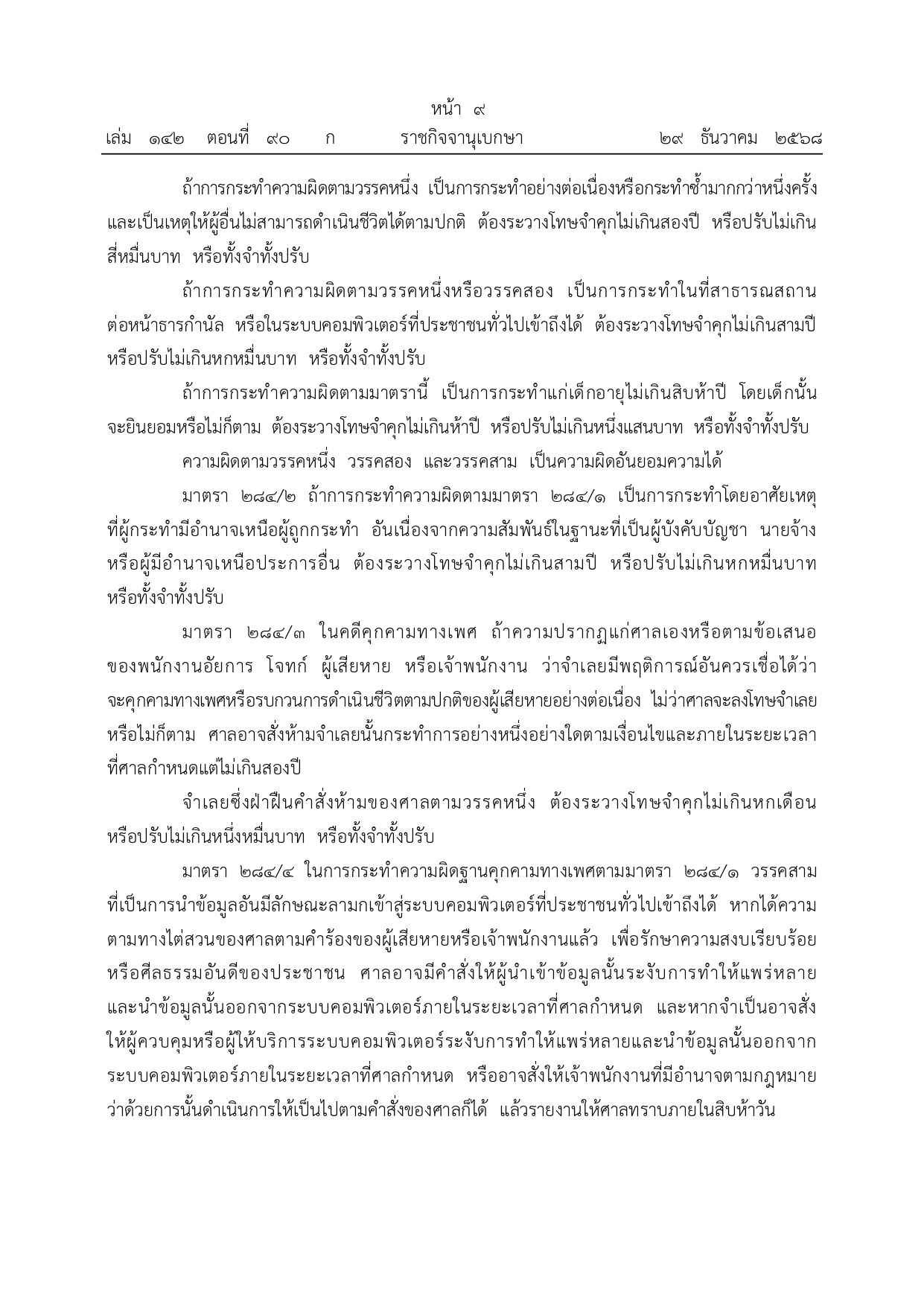 ราชกิจจานุเบกษา เผยแพร่ พ.ร.บ.แก้ไขเพิ่มเติมกฎหมายอาญา ความผิดฐานคุกคามทางเพศ เริ่มใช้วันนี้ (30 ธ.ค.)