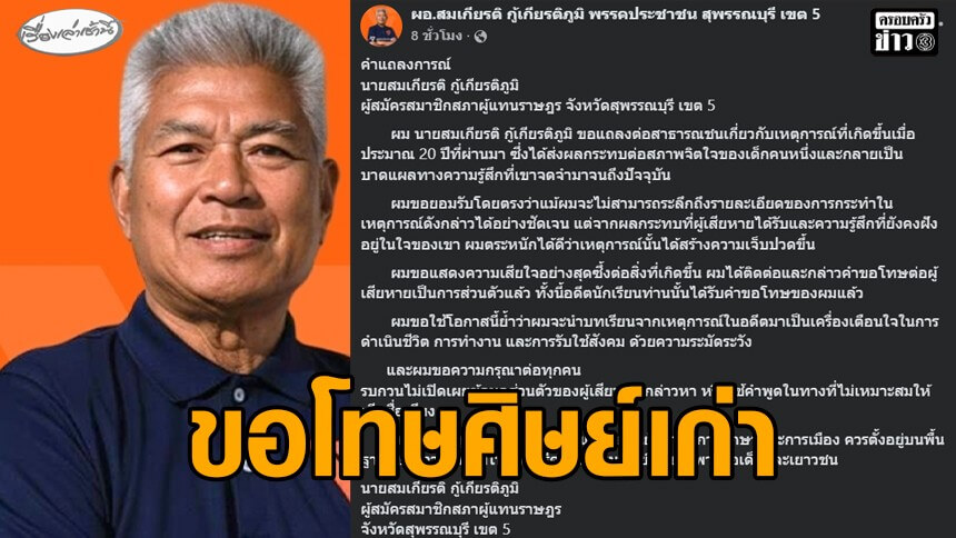 นายสมเกียรติ กู้เกียรติภูมิ ผู้สมัคร สส.จังหวัดสุพรรณบุรี เขต 5 จากพรรคประชาชน โพสต์เฟซบุ๊กขอโทษ หลังผู้ใช้โซเชียลรายหนึ่งอ้างว่าเป็นศิษย์เก่าแฉว่าเคยทำโทษนักเรียนวัย 10 ขวบ ให้นำรองเท้า ผูกเชือกแขวนคอ เดินเท้าเปล่า ตลอดทั้งวัน