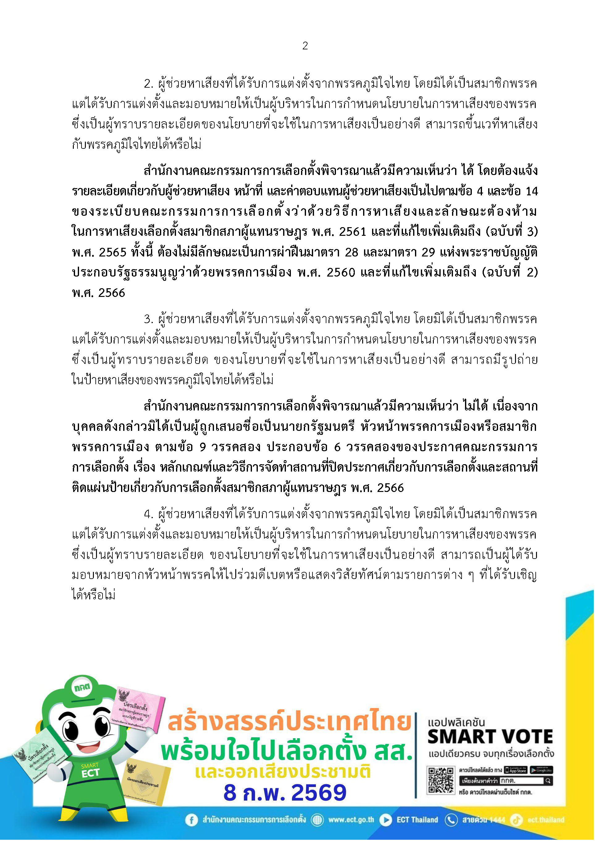 สำนักงานคณะกรรมการการเลือกตั้ง ได้ทำหนังสือตอบข้อสอบถาม กรณีพรรคภูมิใจไทย ได้ขอสอบถามเกี่ยวกับการปฏิบัติของพรรคการเมืองให้ถูกต้องตามกฎหมายเกี่ยวกับการเลือกตั้งและพรรคการเมือง หรือข้อกำหนด ระเบียบ หรือประกาศของคณะกรรมการการเลือกตั้ง โดยนำเข้าที่ประชุมคณะกรรมการการเลือกตั้งเพื่อพิจารณา รวม 4 ประเด็น