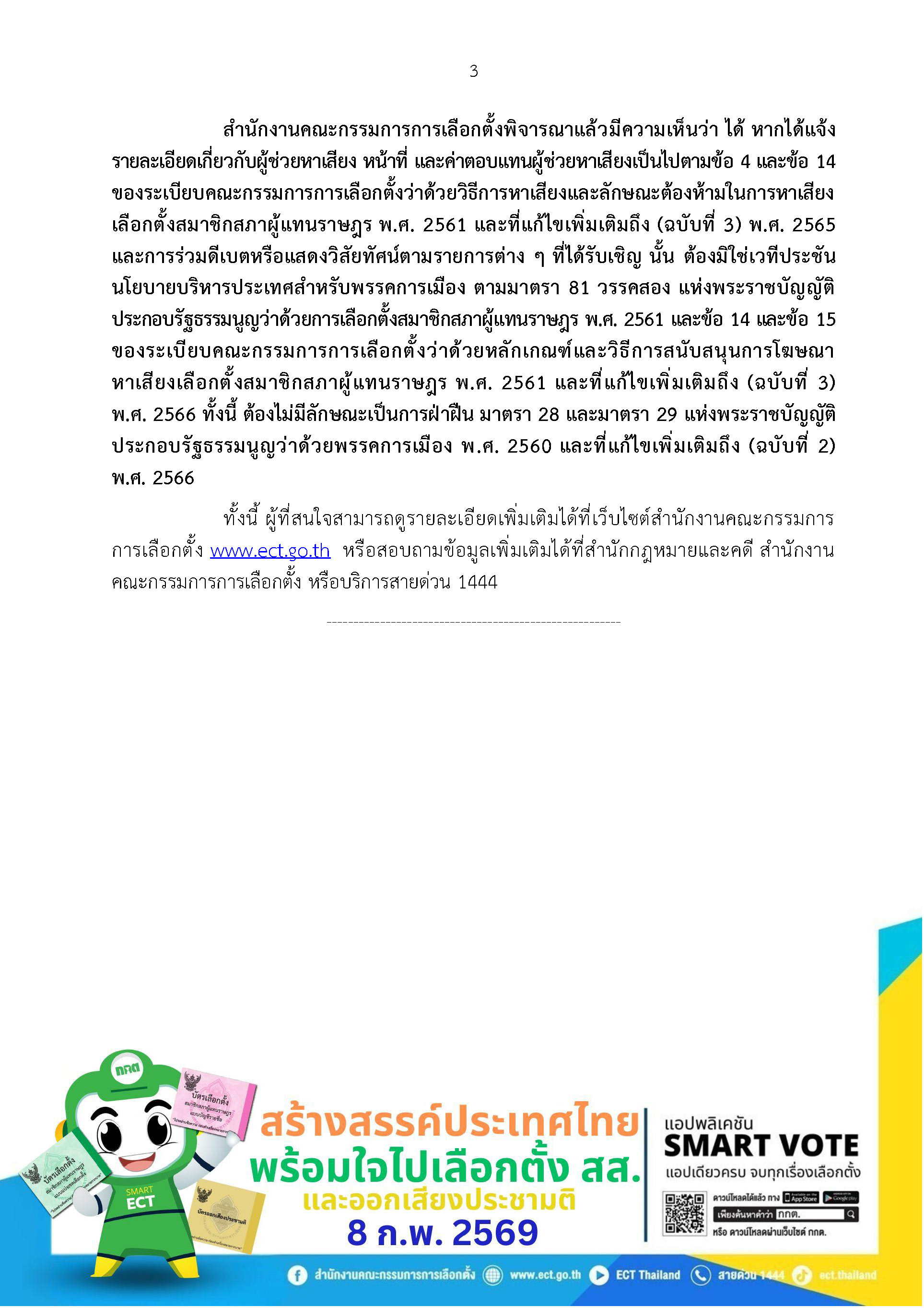 สำนักงานคณะกรรมการการเลือกตั้งพิจารณาแล้วมีความเห็นว่า “ได้” หากได้แจ้งรายละเอียดเกี่ยวกับผู้ช่วยหาเสียง หน้าที่ และค่าตอบแทนผู้ช่วยหาเสียงเป็นไปตามข้อ 4 และข้อ 14 ของระเบียบคณะกรรมการการเลือกตั้งว่าด้วยวิธีการหาเสียงและลักษณะต้องห้ามในการหาเสียงเลือกตั้งสมาชิกสภาผู้แทนราษฎร พ.ศ. 2561 และที่แก้ไขเพิ่มเติมถึง (ฉบับที่ 3) พ.ศ. 2565และการร่วมดีเบตหรือแสดงวิสัยทัศน์ตามรายการต่าง ๆ ที่ได้รับเชิญ นั้น ต้องมิใช่เวทีประชันนโยบายบริหารประเทศสำหรับพรรคการเมือง ตามมาตรา 81 วรรคสอง แห่งพระราชบัญญัติประกอบรัฐธรรมนูญว่าด้วยการเลือกตั้งสมาชิกสภาผู้แทนราษฎร พ.ศ. 2561 และข้อ 14 และข้อ 15ของระเบียบคณะกรรมการการเลือกตั้งว่าด้วยหลักเกณฑ์และวิธีการสนับสนุนการโฆษณาหาเสียงเลือกตั้งสมาชิกสภาผู้แทนราษฎร พ.ศ. 2561 และที่แก้ไขเพิ่มเติมถึง (ฉบับที่ 3) พ.ศ. 2566 ทั้งนี้ ต้องไม่มีลักษณะเป็นการฝ่าฝืน มาตรา 28 และมาตรา 29 แห่งพระราชบัญญัติประกอบรัฐธรรมนูญว่าด้วยพรรคการเมือง พ.ศ. 2560 และที่แก้ไขเพิ่มเติมถึง (ฉบับที่ 2) พ.ศ. 2566
