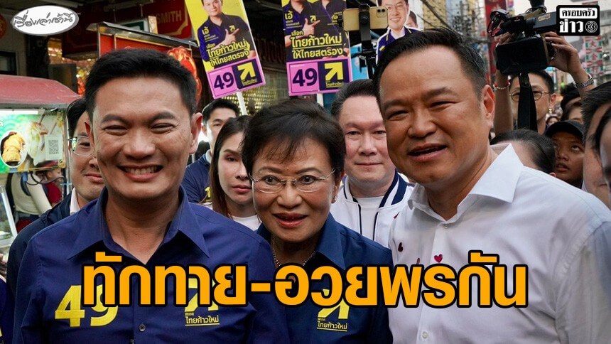 “อนุทิน” นำ ภท. หาเสียงถนนเยาวราช ชนพรรคไทยก้าวใหม่ ก่อนตะโกนเรียกข้ามฝั่ง ด้าน “ดร.เอ้-คุณหญิงกัลยา” ปรี่เข้าทักทายสวมกอด อวยพรกันและกัน บอกเจอในสภา ขณะพ่อค้าแม่ค้าทวงคนละครึ่งพลัส พร้อมติดสติ๊กเกอร์หัวใจนายกฯ ขอจัดการเขมรให้ราบคาบ ก่อนปิดจบทริป กินก๋วยจั๊บร้านดัง-ไหว้พระขอพร
