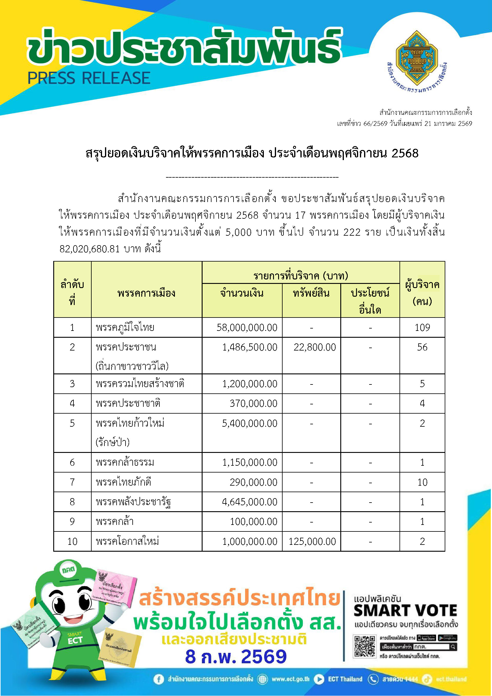 วันที่ 21 มกราคม 2569 สำนักงานคณะกรรมการการเลือกตั้ง เปิดเผยยอดเงินบริจาคให้กับพรรคการเมืองประจำเดือนพฤศจิกายน 2568 จำนวน 17 พรรคการเมือง โดยมีผู้บริจาคเงินให้พรรคการเมืองที่มีจำนวนเงินตั้งแต่ 5,000 บาทขึ้นไปจำนวน 222 ราย เป็นเงินทั้งสิ้น 82,020,680.81 บาท