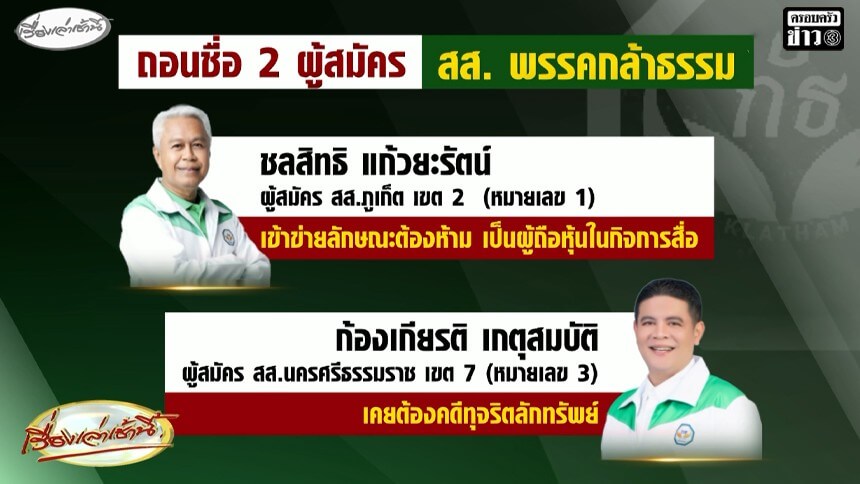 กล้าธรรมระส่ำ! ศาลฎีกาสั่งถอนชื่อ “ชลสิทธิ แก้วยะรัตน์” ผู้สมัคร สส. ภูเก็ต เขตเลือกตั้งที่ คดีถือหุ้นสื่อ ขณะที่ กกต. ฟัน "ก้องเกียรติ เกตุสมบัติ" ผู้สมัคร สส. เขต 7 นครศรีธรรมราช ขาดคุณสมบัติ เหตุเคยต้องโทษคดีลักต้นไม้