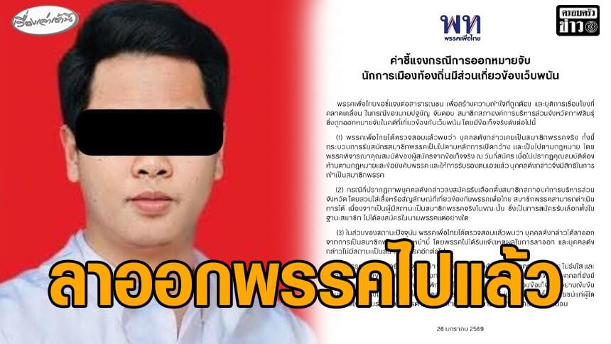 “เพื่อไทย” รับ “สจ.เอี่ยวเว็บพนัน” เคยเป็นสมาชิกแต่ลาออกไปแล้ว ยันไม่ปกป้อง
