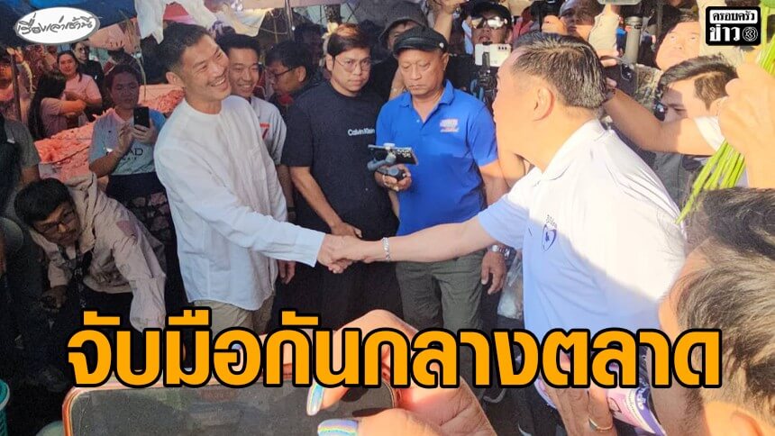 "อนุทิน" เดินหาเสียงตลาดเจ้าพรหม บังเอิญเจอ "ธนาธร" จับมือทักทายกัน