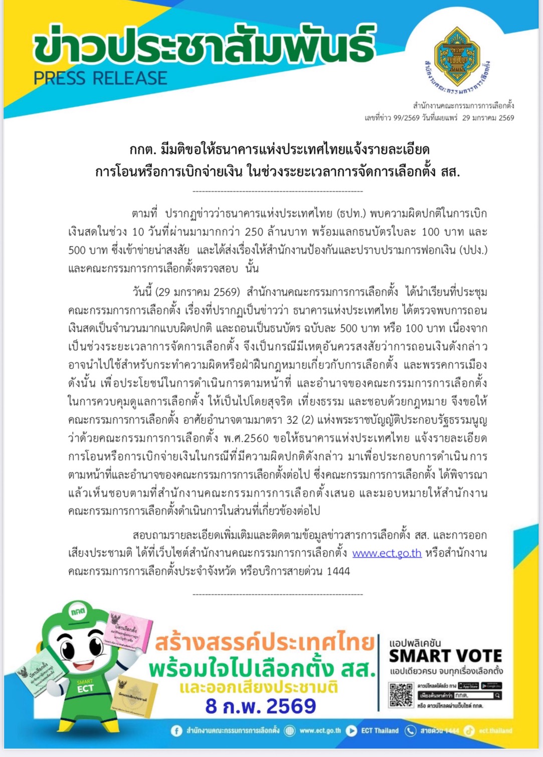 วันนี้ (29 มกราคม 2569) สำนักงานคณะกรรมการการเลือกตั้ง ได้นำเรียนที่ประชุมคณะกรรมการการเลือกตั้ง เรื่องที่ปรากฏเป็นข่าวว่า ธนาคารแห่งประเทศไทย ได้ตรวจพบการถอนเงินสดเป็นจำนวนมากแบบผิดปกติ และถอนเป็นธนบัตร ฉบับละ 500 บาท หรือ 100 บาท เนื่องจากเป็นช่วงระยะเวลาการจัดการเลือกตั้ง จึงเป็นกรณีมีเหตุอันควรสงสัยว่าการถอนเงินดังกล่าวอาจนำไปใช้สำหรับกระทำความผิดหรือฝ่าฝืนกฎหมายเกี่ยวกับการเลือกตั้ง และพรรคการเมืองดังนั้น เพื่อประโยชน์ในการดำเนินการตามหน้าที่ และอำนาจของคณะกรรมการการเลือกตั้ง ในการควบคุมดูแลการเลือกตั้ง ให้เป็นไปโดยสุจริต เที่ยงธรรม และชอบด้วยกฎหมาย
