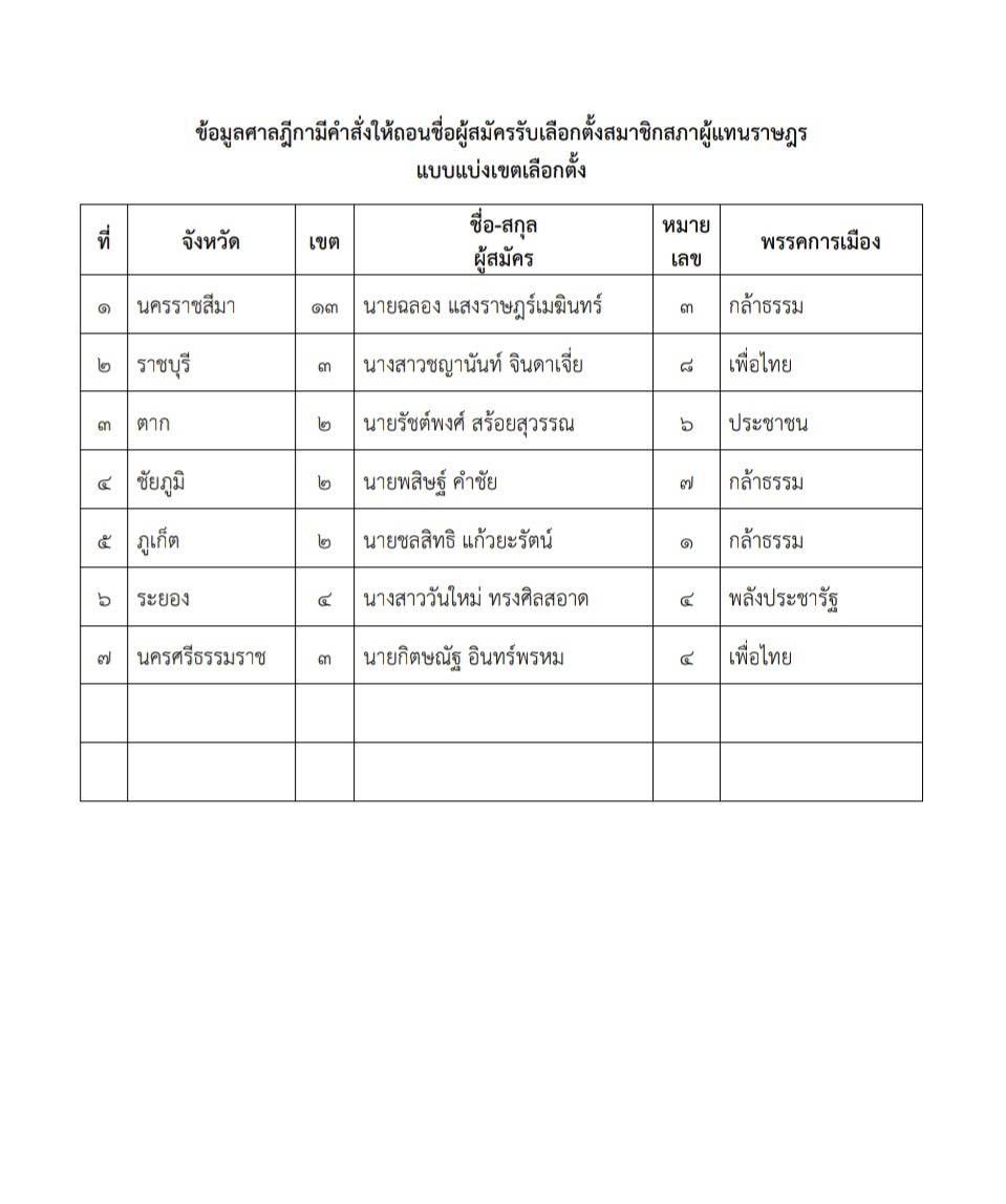 2. พรรคเพื่อไทย : ถูกถอนชื่อ 2 ราย ได้แก่ นางสาวชญานันท์ จินดาเจี่ย จังหวัดราชบุรี เขต 3 และ นายกิตษณัฐ อินทร์พรหม จังหวัดนครศรีธรรมราช เขต 3