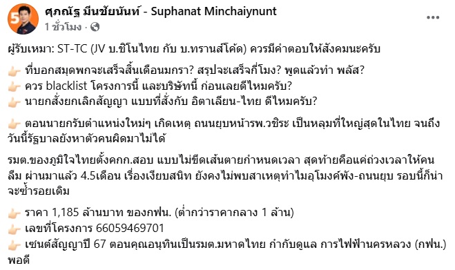 ศุภณัฐ มีนชัยนันท์ ว่าที่ สส.พรรคประชาชน โพสต์ข้อความผ่านทางเฟซบุ๊กส่วนตัว กรณีอาคารโดมถล่มภายในซอยการเคหะแห่งชาติบางพลี ต.บางเสาธง อ.บางเสาธง จ.สมุทรปราการ โดยระบุว่า ผู้รับเหมา: ST-TC (JV บ.ชิโนไทย กับ บ.ทรานส์โค้ด) ควรมีคำตอบให้สังคมนะครับ ที่บอกสมุดพกจะเสร็จสิ้นเดือนมกรา? สรุปจะเสร็จกี่โมง? พูดแล้วทำ พลัส? ควร blacklist โครงการนี้ และบริษัทนี้ ก่อนเลยดีไหมครับ? นายกสั่งยกเลิกสัญญา แบบที่สั่งกับ อิตาเลียน-ไทย ดีไหมครับ? ตอนนายกรับตำแหน่งใหม่ๆ เกิดเหตุ ถนนยุบหน้าโรงพยาบาลวชิระ เป็นหลุมที่ใหญ่สุดในไทย จนถึงวันนี้รัฐบาลยังหาตัวคนผิดมาไม่ได้
