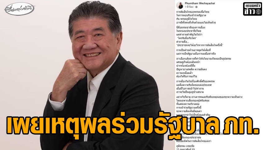 วันนี้ (15 กุมภาพันธ์ 69) นายภูมิธรรม เวชยชัย แกนนำพรรคเพื่อไทย โพสต์เฟซบุ๊กชี้แจง “การตัดสินใจของพรรคเพื่อไทยในการตอบรับเข้าร่วมรัฐบาลกับพรรคภูมิใจไทย อาจมีทั้งคนที่เห็นด้วยและไม่เห็นด้วย นี่คือธรรมชาติของการเมืองในระบอบประชาธิปไตย แต่คำถามสำคัญไม่ใช่ว่า “ใครจับมือกับใคร” คำถามคือ… “ประชาชนจะได้อะไรจากการตัดสินใจครั้งนี้”