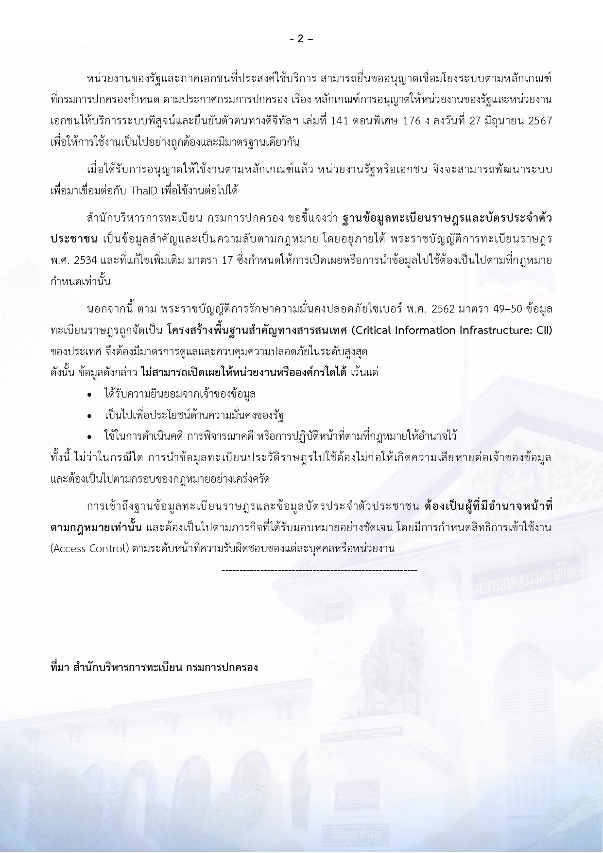หน่วยงานของรัฐและภาคเอกชนที่ประสงค์ใช้บริการ สามารถยื่นขออนุญาตเชื่อมโยงระบบตามหลักเกณฑ์ที่กรมการปกครองกำหนด ตามประกาศกรมการปกครอง เรื่อง หลักเกณฑ์การอนุญาตให้หน่วยงานของรัฐและหน่วยงานเอกชนให้บริการระบบพิสูจน์และยืนยันตัวตนทางดิจิทัลฯ เล่มที่ 141 ตอนพิเศษ 176 ง ลงวันที่ 27 มิถุนายน 2567 เพื่อให้การใช้งานเป็นไปอย่างถูกต้องและมีมาตรฐานเดียวกัน