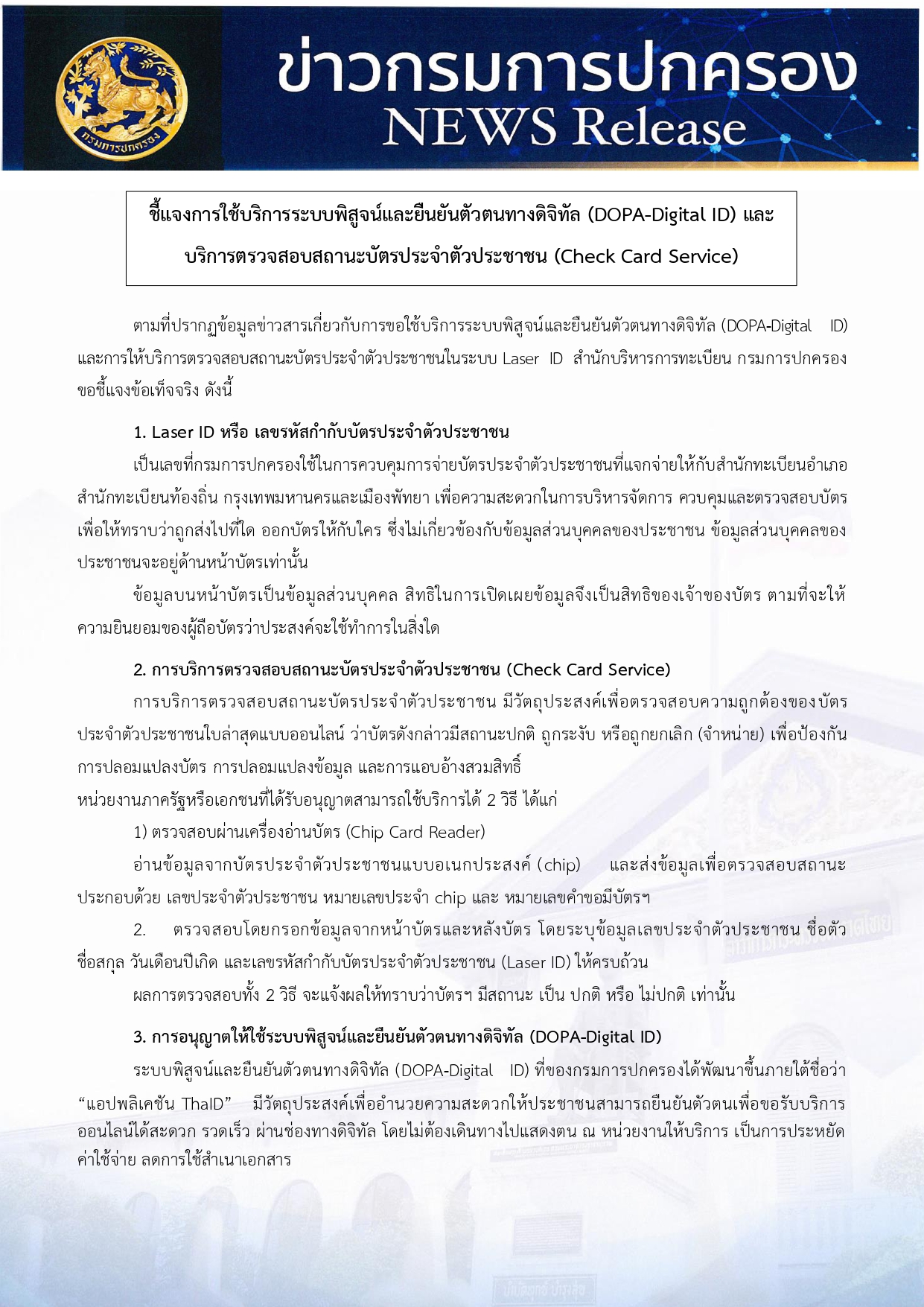 กรมการปกครอง ออกเอกสารข่าวชี้แจงการใช้บริการระบบพิสูจน์และยืนยันตัวตนทางดิจิทัล (DOPA-Digital ID) และบริการตรวจสอบสถานะบัตรประจำตัวประชาชน (Check Card Service) ระบุว่า