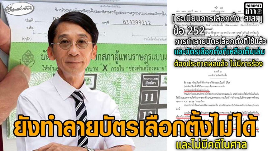 ถ้ามีการทำลายบัตรเลือกตั้งที่เหลือไปแล้วจริง ๆ ไม่ทราบท่านเลขาธิการได้มีการแต่งตั้งคณะกรรมการทำลายบัตรเลือกตั้งส่วนกลางแล้วหรือไม่? เรื่องนี้ กกต. ต้องแถลงต่อสาธารณชน รวมถึงชี้แจงด้วยว่าการทำลาย “บัตรเลือกตั้งที่เหลือเต็มเล่ม” ได้ทำตามหลักเกณฑ์และเงื่อนไขตามระเบียบเลือกตั้งข้อ 252 แล้วหรือไม่?