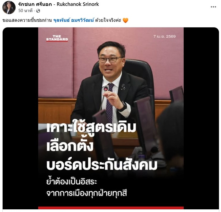 เมื่อวันที่ 7 เม.ย.69 นางสาวรักชนก ศรีนอก สส.บัญชีรายชื่อ พรรคประชาชน ได้โพสต์ข้อความ ภายหลังนายจุลพันธ์ อมรวิวัฒน์ รมว.แรงงาน แถลงภายหลังเข้ากระทรวงแรงงานเป็นวันแรก โดย กล่าวย้ำถึงการเลือกตั้งคณะกรรมการประกันสังคม (บอร์ดประกันสังคม) ว่าเตรียมลงนามให้มีการใช้ระเบียบการเลือกตั้งตัวเดิม ที่ใช้สูตรการเลือกตั้ง 1 คนเลือก 7 คน ว่า “ขอแสดงความชื่นชมท่าน จุลพันธ์ อมรวิวัฒน์ ด้วยใจจริงค่ะ”