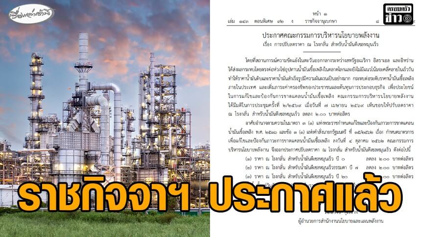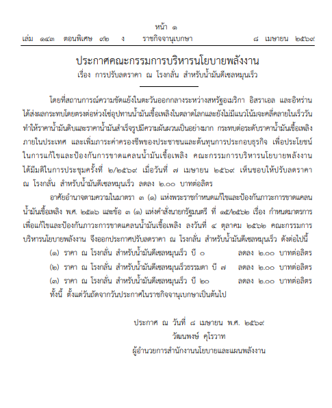เพื่อประโยชน์ในการแก้ไขและป้องกันการขาดแคลนน้ำมันเชื้อเพลิง คณะกรรมการบริหารนโยบายพลังงาน ได้มีมติในการประชุมครั้งที่ 2/2569 เมื่อวันที่ 7 เมษายน 2569 เห็นชอบให้ปรับลดราคา ณ โรงกลั่น สําหรับน้ำมันดีเซลหมุนเร็ว ลดลง 2.00 บาทต่อลิตร อาศัยอํานาจตามความในมาตรา 3 (1) แห่งพระราชกําหนดแก้ไขและป้องกันภาวะการขาดแคลนน้ำมันเชื้อเพลิง พ.ศ. 2516 และข้อ 3 (1) แห่งคําสั่งนายกรัฐมนตรี ที่ 15/2562 เรื่อง กําหนดมาตรการ เพื่อแก้ไขและป้องกันภาวะการขาดแคลนน้ำมันเชื้อเพลิง ลงวันที่ 4 ตุลาคม 2562
