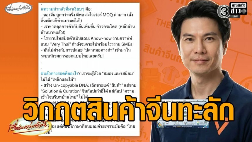 สส.พรรคประชาชน เตือนผู้ประกอบการไทย เตรียมรับมือวิกฤต China Shock 2.0 หลังสินค้าจีนทะลักเข้าตลาดไทยและอาเซียน ราคาถูกกว่าครึ่ง ส่งเร็วกว่า ทำไทยขาดดุลการค้าจีนพุ่งสูงเป็นประวัติการณ์ โรงงาน SMEs ไทยต้องทยอยปิดตัว