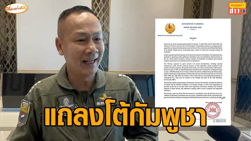 เมื่อวันที่ 23 เม.ย. 2569 พล.อ.อ.ประภาส สอนใจดี ผู้อำนวยการศูนย์ข่าวสารสถานการณ์ ไทย–กัมพูชา กล่าวถึงกรณีแถลงการณ์ของกระทรวงวัฒนธรรมและวิจิตรศิลป์แห่งราชอาณาจักรกัมพูชา ลงวันที่ 22 เม.ย. ว่า ไทยขอยืนยันข้อเท็จจริงและจุดยืนของประเทศไทย โดยย้ำว่าไทยยึดมั่นถ้อยแถลงร่วมและกฎหมายระหว่างประเทศ