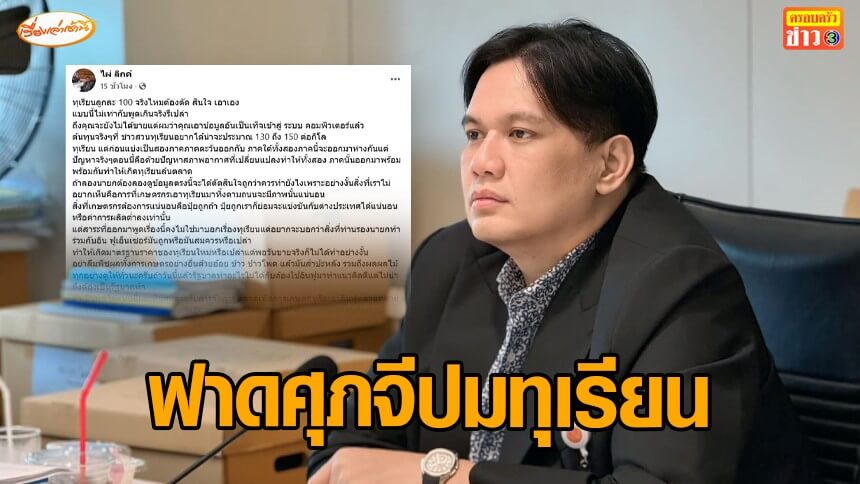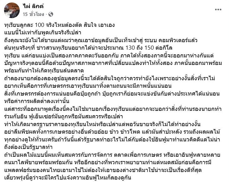 แต่สาระที่ออกมาพูดเรื่องนี้คงไม่ใช่มาบอกเรื่องทุเรียน แต่อยากจะบอกว่าสิ่งที่ท่านรองนายกฯทำร่วมกับอินฟลูเอนเซอร์มันถูกหรือมันสมควรหรือเปล่า ทำให้เกิดมาตรฐานราคาของทุเรียนใหม่หรือเปล่า แต่พอวันขายจริงก็ไม่ได้ทำอย่างงั้น