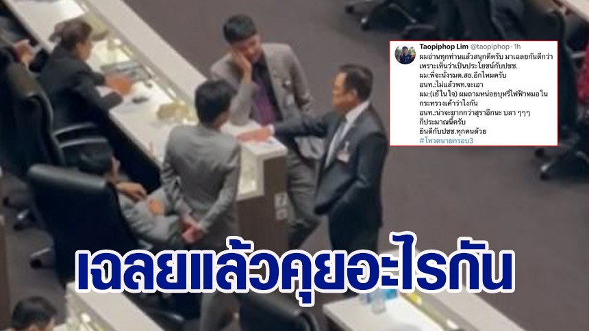 หลังจากมีสื่อนำเสนอภาพที่ นายอนุทิน ชาญวีรกุล หัวหน้าพรรคภูมิใจไทย เดินมาทักทาย พูดคุยบางอย่างกับ สส.ก้าวไกล ระหว่างโหวตนายกฯ ซึ่งนายเท่าพิภพ ลิ้มจิตรกร สส. ก้าวไกล ทวีตข้อความ