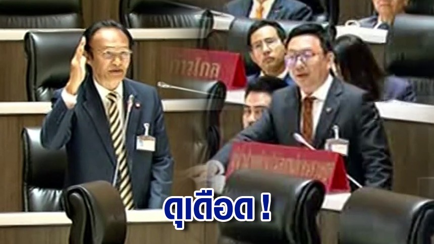 การตั้งกระทู้ถามของคุณชัยธวัช เดือดมากขึ้นในการตั้งคำถามครั้งที่สองที่แตะไปถึง "ชั้น 14 โรงพยาบาลตำรวจ" จนทำให้ สส.เพื่อไทยลุกขึ้นประท้วง และมีการตอบโต้กันดุเดือด