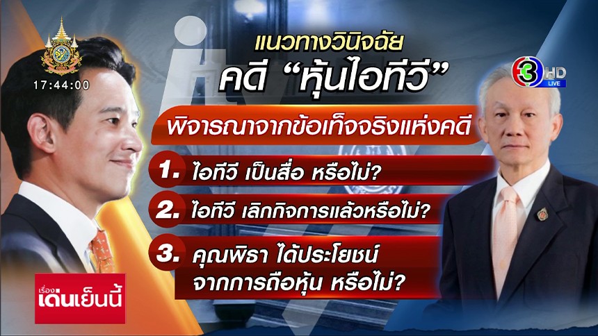 โดยพรุ่งนี้ (23 ม.ค. 67) เวลา 09.30 น. องค์คณะตุลาการศาลรัฐธรรมนูญ จะประชุมคดีหุ้น ไอทีวีของ นายพิธา จำนวน 42,000 หุ้น แต่ด้วยตามรัฐธรรมนูญ มาตรา 98 (3) ที่ห้ามผู้สมัคร สส. เป็นเจ้าของกิจการ หรือ ถือหุ้นในกิจการหนังสือพิมพ์ หรือสื่อมวลชนใดๆ แต่ไอทีวีก็ยุติกิจกรรมสื่อไปตั้งปี 2550 ทำให้เกิดคำถามว่า ตกลงแล้วไอทีวี ยังเป็นสื่ออยู่หรือไม่