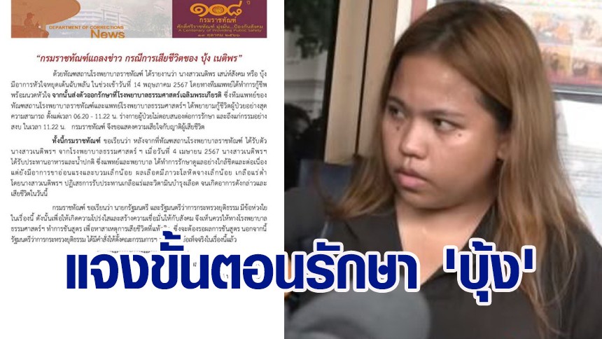 กรมราชทัณฑ์ ออกเอกสารชี้แจงการเสียชีวิตของ น.ส.เนติพร หรือ บุ้ง ทะลุวัง ว่า ด้วยทัณฑสถานโรงพยาบาลราชทัณฑ์ ได้รายงานว่า น.ส.เนติพร มีอาการหัวใจหยุดเต้นฉับพลัน ในช่วงเช้าวันที่ 14 พ.ค.2567 โดยทางทีมแพทย์ได้ทำการกู้ชีพ พร้อมนวดหัวใจ จากนั้นส่งตัวออกรักษาที่โรงพยาบาลธรรมศาสตร์เฉลิมพระเกียรติ