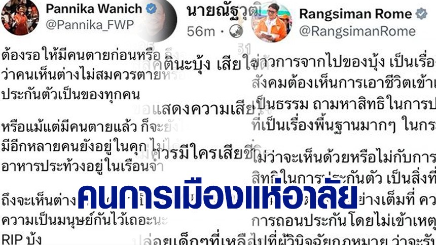 คนการเมืองอาลัย 'บุ้ง' แห่โพสต์สะท้อนยุติธรรมไทย หวังการเปลี่ยนแปลง เห็นต่างไม่ควรติดคุก
