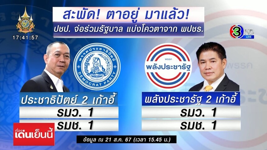 สะพัด! ปชป.ร่วมรัฐบาล. แบ่งโควตาจาก พปชร. 2 เก้าอี้