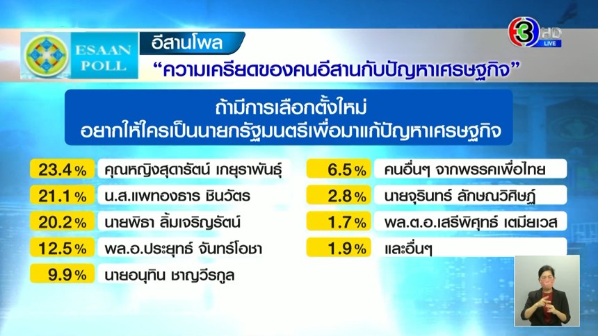 เมื่อสอบถามต่อว่า ถ้ามีการเลือกตั้งใหม่ ท่านอยากให้ใครเป็นนายกรัฐมนตรีเพื่อมาแก้ปัญหาเศรษฐกิจพบว่า อันดับ1 เป็นของ คุณหญิงสุดารัตน์ เกยุราพันธุ์ ร้อยละ 23.4 รองลงมาคุณแพทองธาร ชินวัตร ร้อยละ 21.1 อันดับ 3 คุณพิธา ลิ้มเจริญรัตน์ ร้อยละ 20.2 ตามมาด้วย พล.อ.ประยุทธ์ จันทร์โอชา ร้อยละ 12.5 นานอนุทิน ชาญวีรกุล ร้อยละ 9.9 คนอื่นๆ จากพรรคเพื่อไทย ร้อยละ 6.5 คุณจุรินทร์ ลักษณวิศิษฎ์ ร้อยละ 2.8 พล.ต.อ.เสรีพิศุทธ์ เตมียเวส ร้อยละ 1.7 และอื่นๆ ร้อยละ 1.9