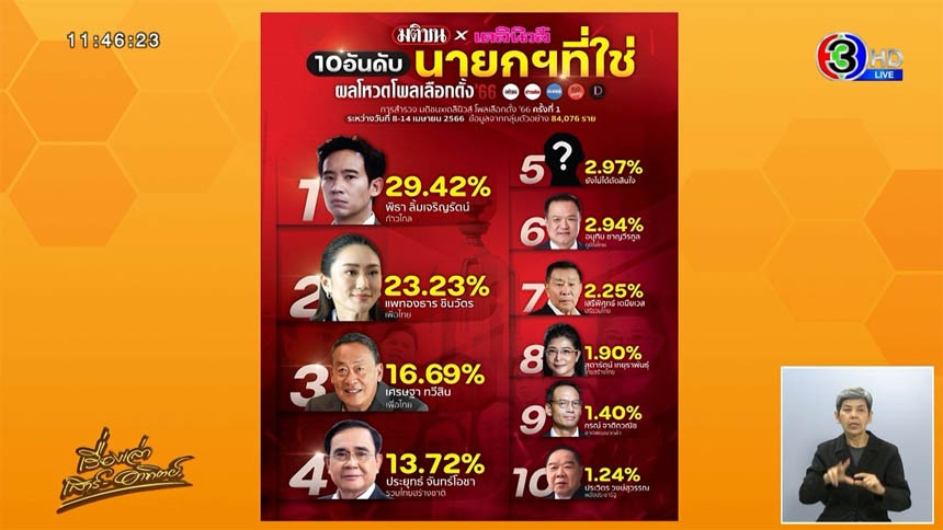หัวข้อคำถามที่ 1 ท่านจะเลือกใครเป็นนายกรัฐมนตรี ในการเลือกตั้ง 2566 พบว่าในกลุ่ม 10 อันดับแรก ผู้ได้รับการโหวตเป็นอันดับ 1 คือ นายพิธา ลิ้มเจริญรัตน์ จากพรรคก้าวไกล ร้อยละ 29.42, อันดับ 2 น.ส.แพทองธาร ชินวัตร จากพรรคเพื่อไทย ร้อยละ 23.23, อันดับ 3 นายเศรษฐา ทวีสิน จากพรรคเพื่อไทย ร้อยละ 16.69, อันดับ 4 พล.อ.ประยุทธ์ จันทร์โอชา จากพรรครวมไทยสร้างชาติ ร้อยละ 13.72, อันดับ 5 ยังไม่ตัดสินใจ (ว่าจะเลือกใคร) ร้อยละ 2.97, อันดับ 6 นายอนุทิน ชาญวีรกูล จากพรรคภูมิใจไทย ร้อยละ 2.94, อันดับ 7 พล.ต.อ.เสรีพิศุทธ์ เตมียเวส จากพรรคเสรีรวมไทย ร้อยละ 2.25, อันดับ 8 คุณหญิงสุดารัตน์ เกยุราพันธุ์ จากพรรคไทยสร้างไทย ร้อยละ 1.90, อันดับ 9 นายกรณ์ จาติกวณิช จากพรรคชาติพัฒนากล้า ร้อยละ 1.40 และอันดับ 10 พล.อ.ประวิตร วงษ์สุวรรณ พรรคพลังประชารัฐ ร้อยละ 1.24